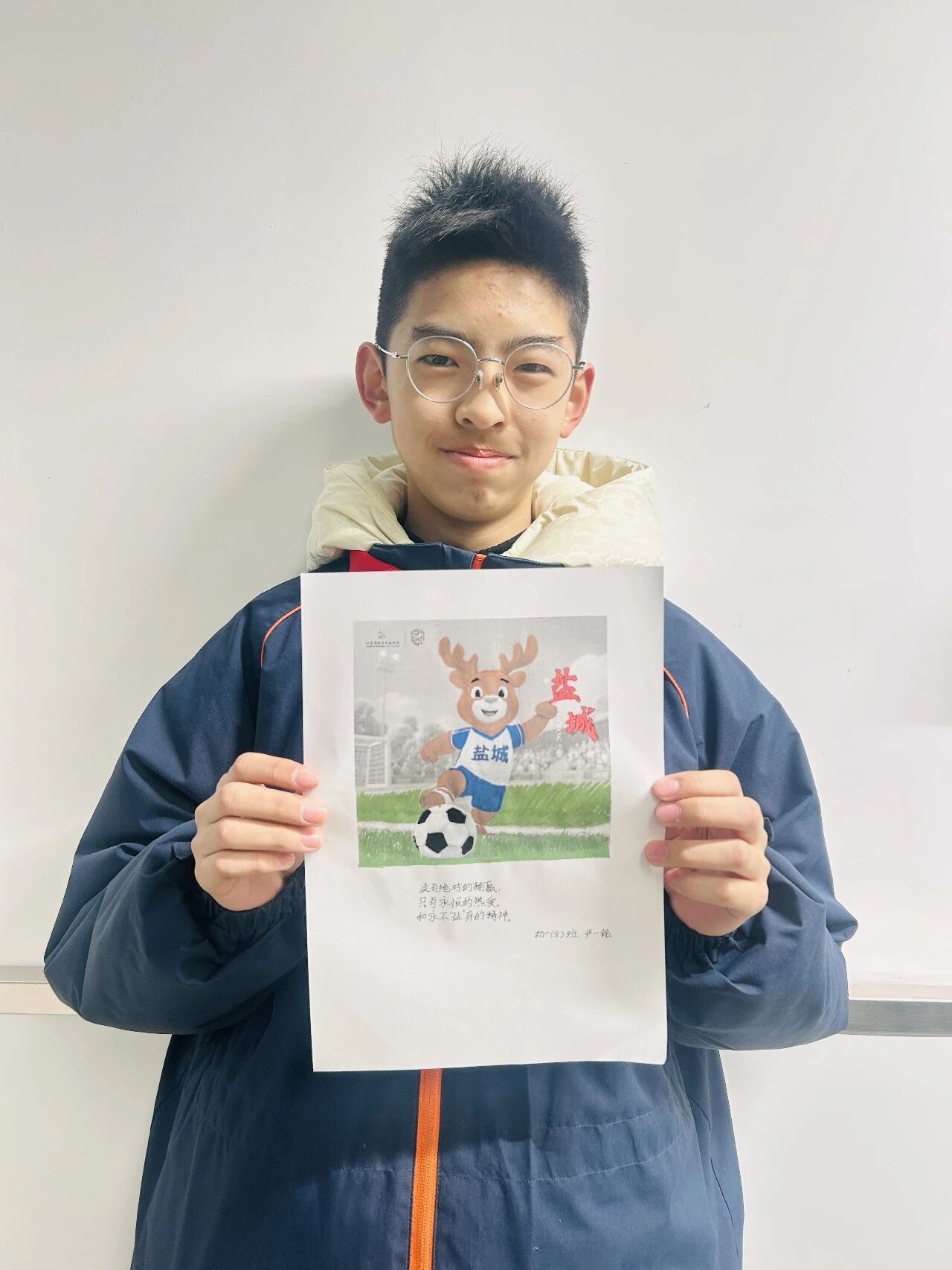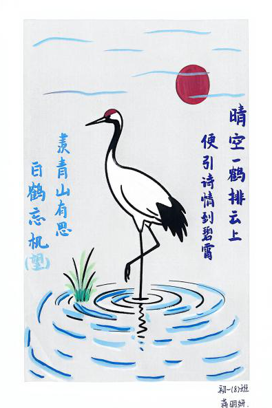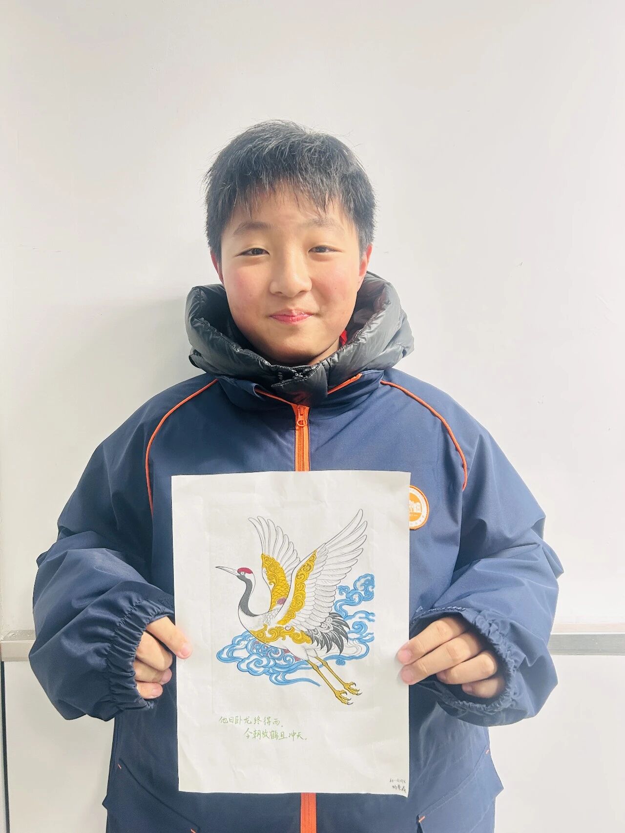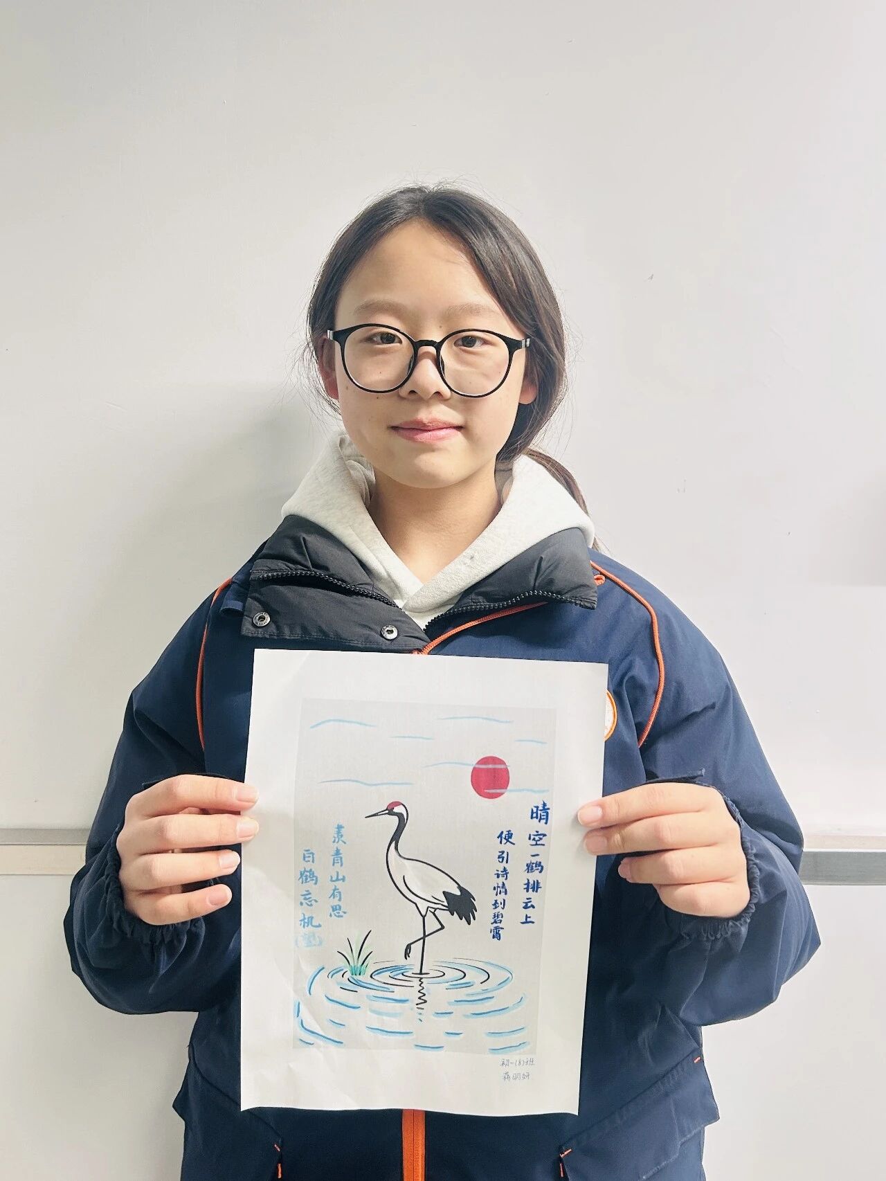 麋鹿创作虽笔墨凝练,却重点突出昂首奋进的神态,深度融合苏超盐城队队徽中的麋鹿元素,将球队永不言弃的拼搏精神与麋鹿坚韧的生存姿态相融。此外,同学们还以丹顶鹤为创作核心,细致描摹仙鹤红顶素羽、展翅翩飞的灵动姿态,勾勒其栖于芦苇、掠于滩涂的雅致画面。每幅作品皆配学生原创感想或雅致诗词,抒发湿地守护之心,赞叹鹤鹿灵动之美,诗情画意间,既藏有对丹顶鹤、麋鹿形态特征的细致观察,更彰显对家乡湿地的热爱与生态保护的初心,每一笔都是对湿地生灵的致敬,每一句感悟都是对绿色家园的期许,这些画作将汇编成《湿地生态手账》,成为校园里流动的生态科普展。